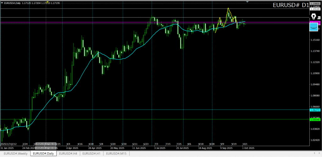 MAがフラット 上向きでエントリーを考える が、日足の戻り売り近い