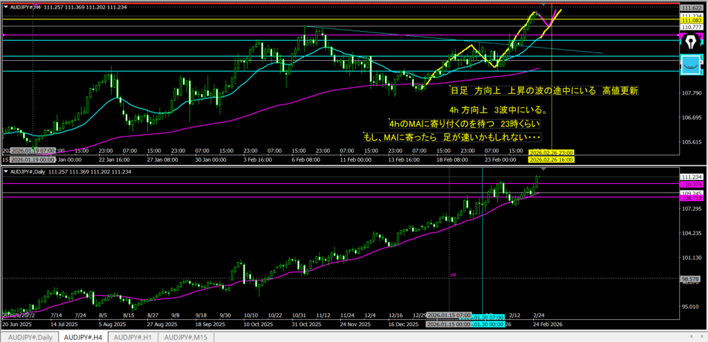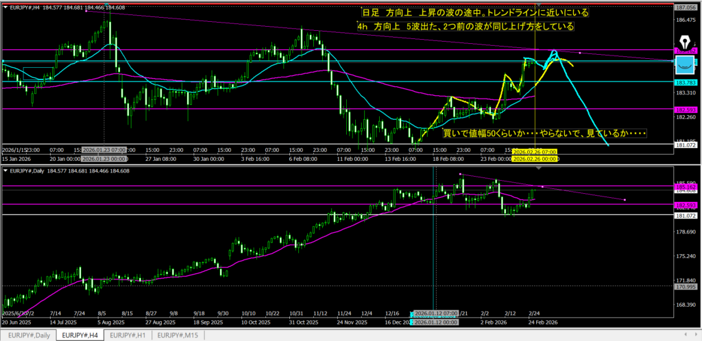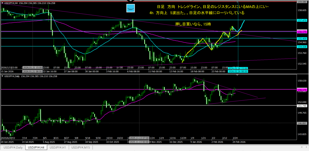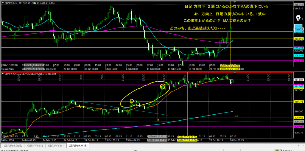 2.25振り返り 下方向に考えていて。 日足のMAに寄り付く形で上に行った。