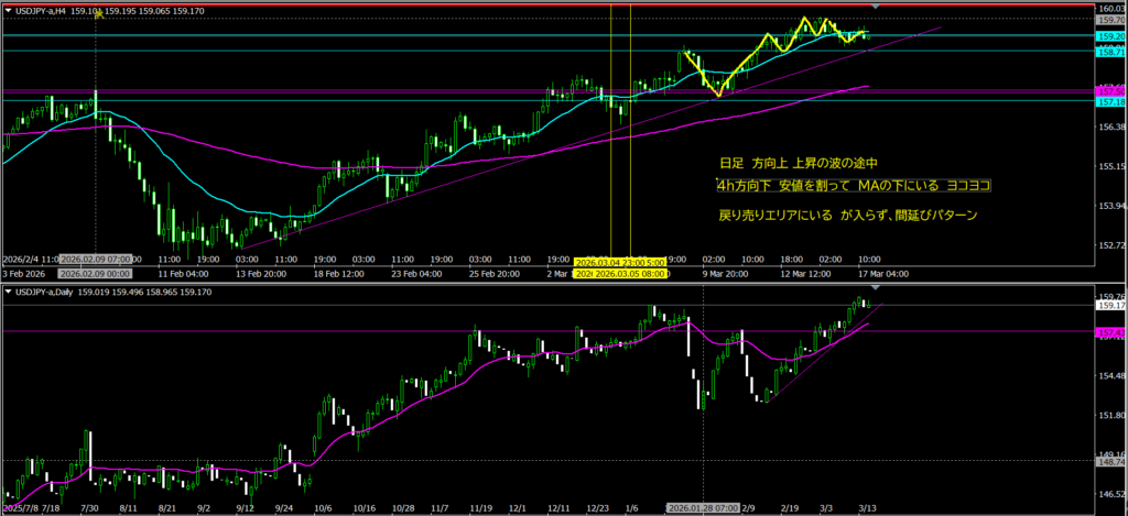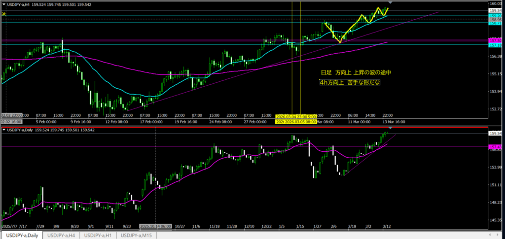 日足上昇の波の途中+4h前回高値と同じ位置  いつも迷う・・・ なのでいつも様子見。   行動としては、一応OKらーめん。