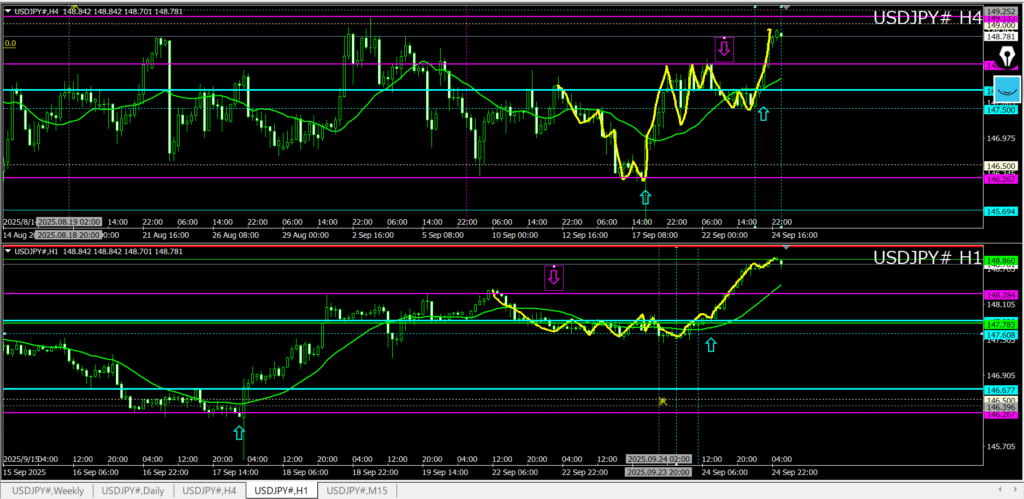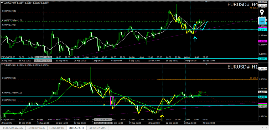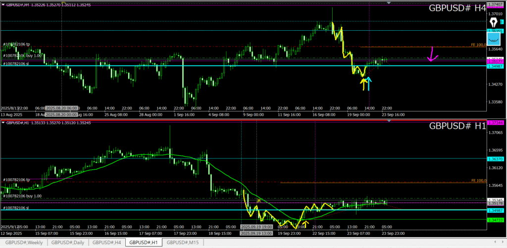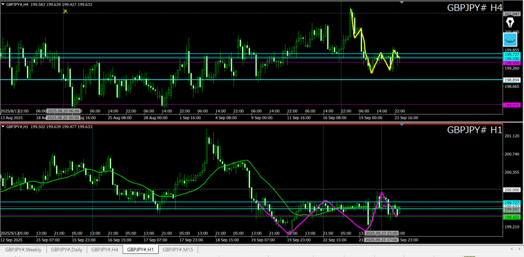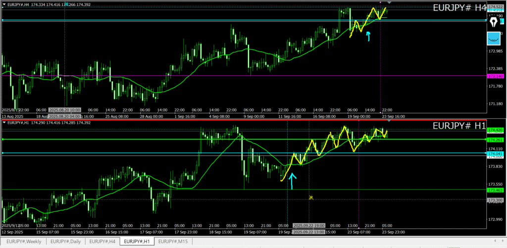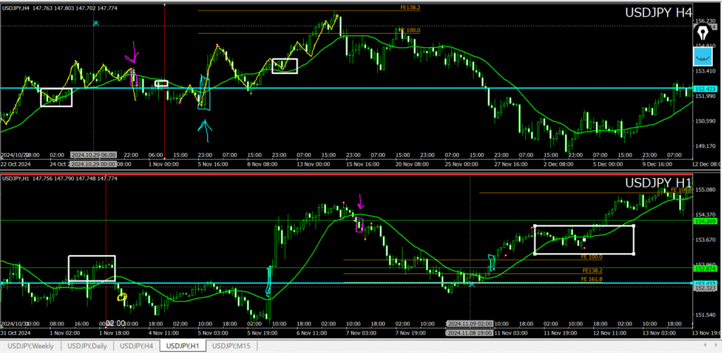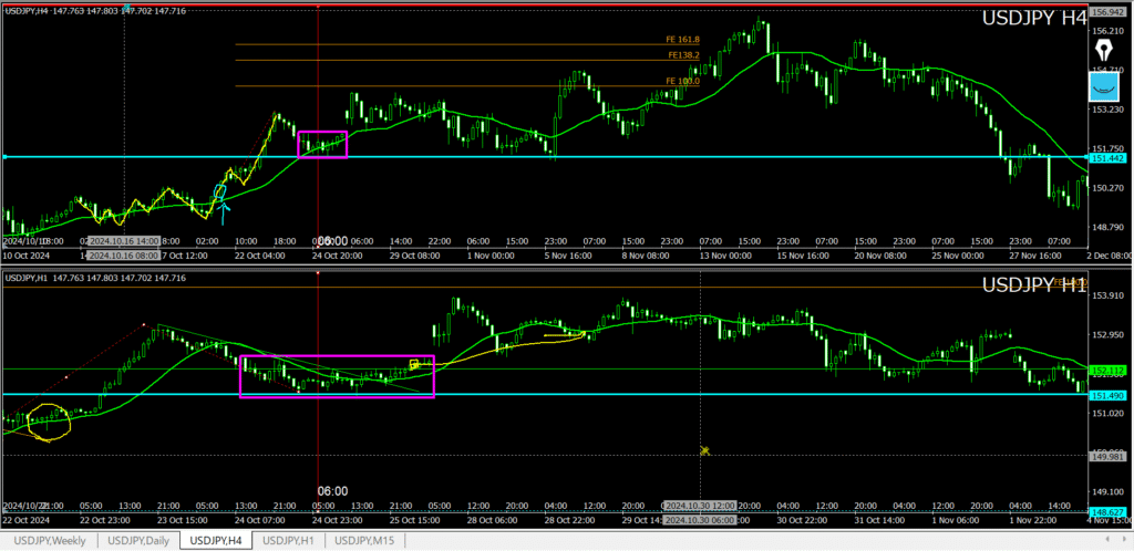 4hのトレンド転換シグナルが出たというのは、わかる。 その後だ。 1h・15mで自分の型になっていかない場合は、ブレーキを踏みたい。 とはいえ、エントリーする性格なので、 入らないか。離脱を早くしたい。 矛盾した物言い・・・