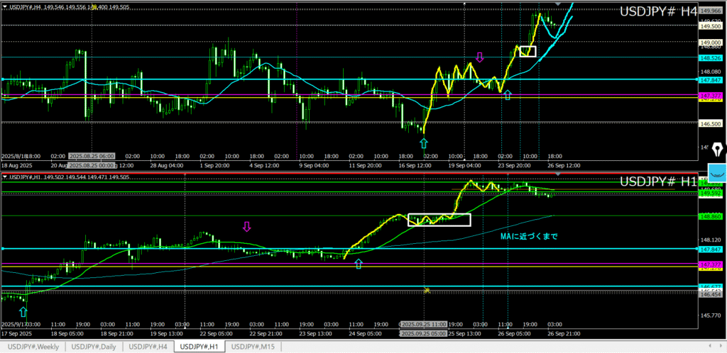 結果、1hのMAに乗っかり、四角というより、下位足では、安値切り上げて、三角=段々畑になった。