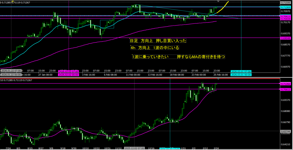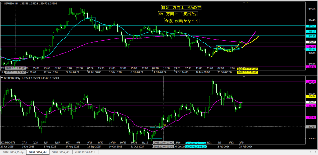2.25振り返り 下方向に考えていて。 日足のMAに寄り付く形で上に行った。